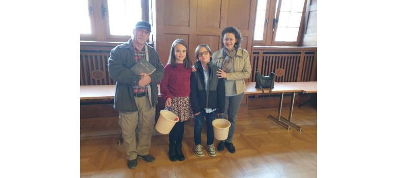 Abschließend bekam jede Schule noch neue Reinigungssets und weiße Rosen. Die weißen Rosen haben unsere Klassensprecher dann noch im Anschluss an die Veranstaltung vor Ort an „unseren“ Stolpersteinen abgelegt.