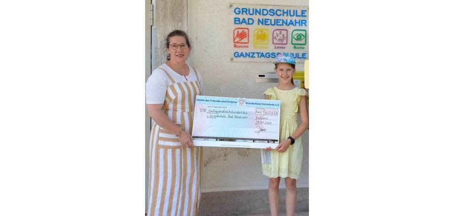 Am 19.07.2022 fuhr eine kleine Delegation unserer Grundschule nach Bad Neuenahr, um Schulleiterin Frau Bell die großartige Spendensumme über 5.603,73 € zu übergeben.
